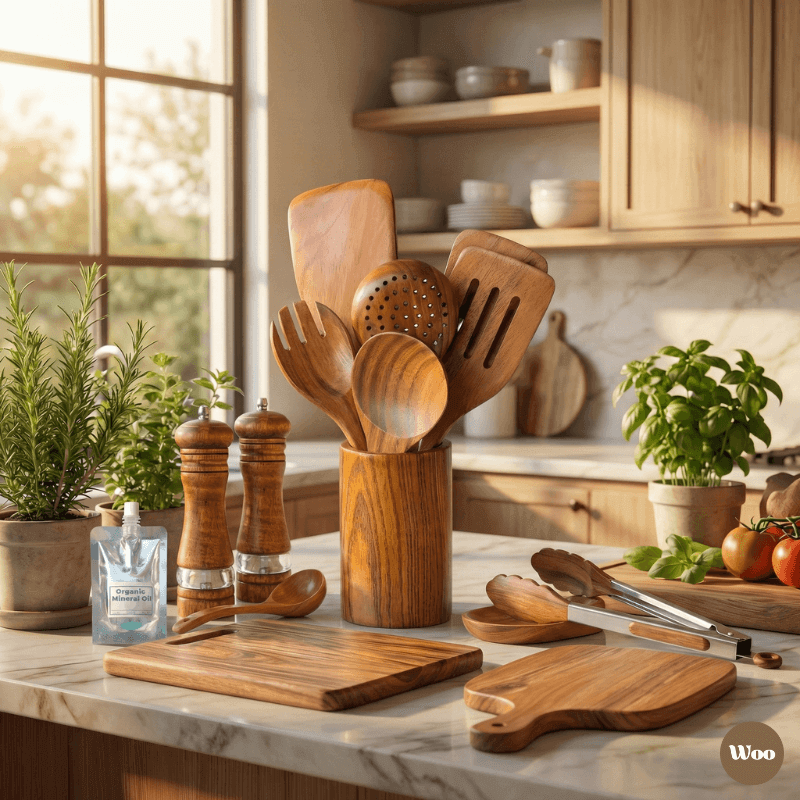 To maintain the quality and longevity of your wooden kitchenware, clean with a damp cloth or mild soap and warm water, and avoid prolonged soaking. Always dry thoroughly after washing. For best results, apply food-grade mineral oil or wood conditioner every few weeks to protect the wood and enhance its natural beauty.