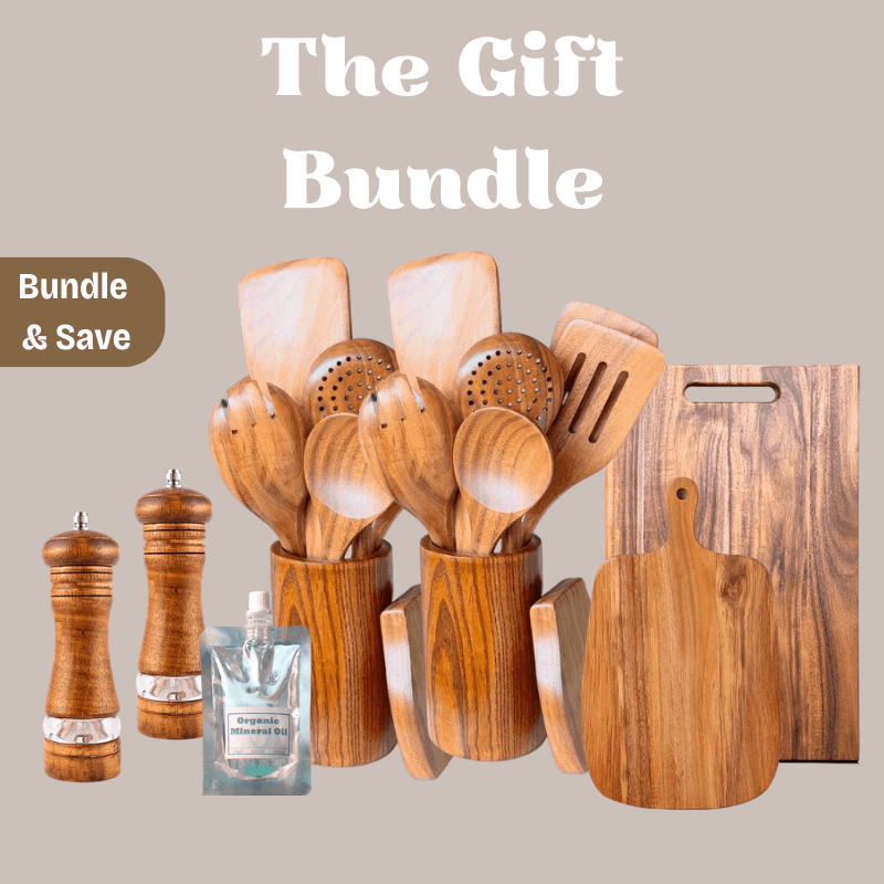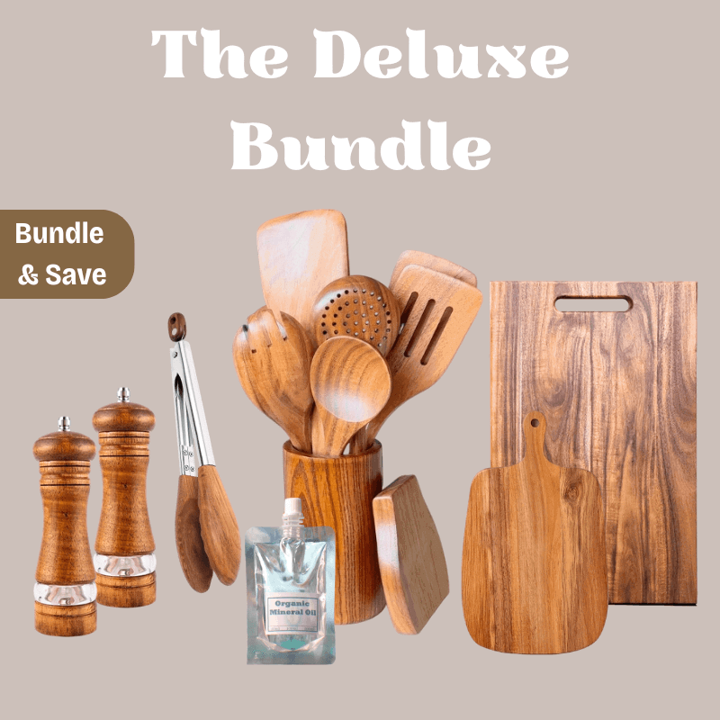 All items in this bundle are crafted from premium, sustainably sourced hardwoods such as teak and acacia. These woods are known for their durability, natural beauty, and resistance to moisture, making them ideal for kitchen use.
