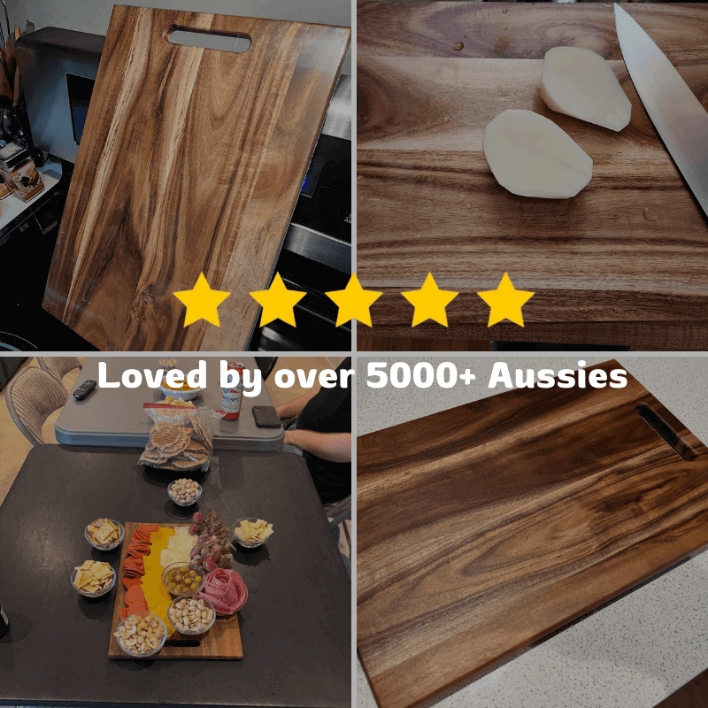 Our chopping board is crafted from 100% premium acacia wood, known for its strength, durability, and beautiful natural grain. It's a sustainable, plastic-free alternative that adds warmth and elegance to any kitchen.